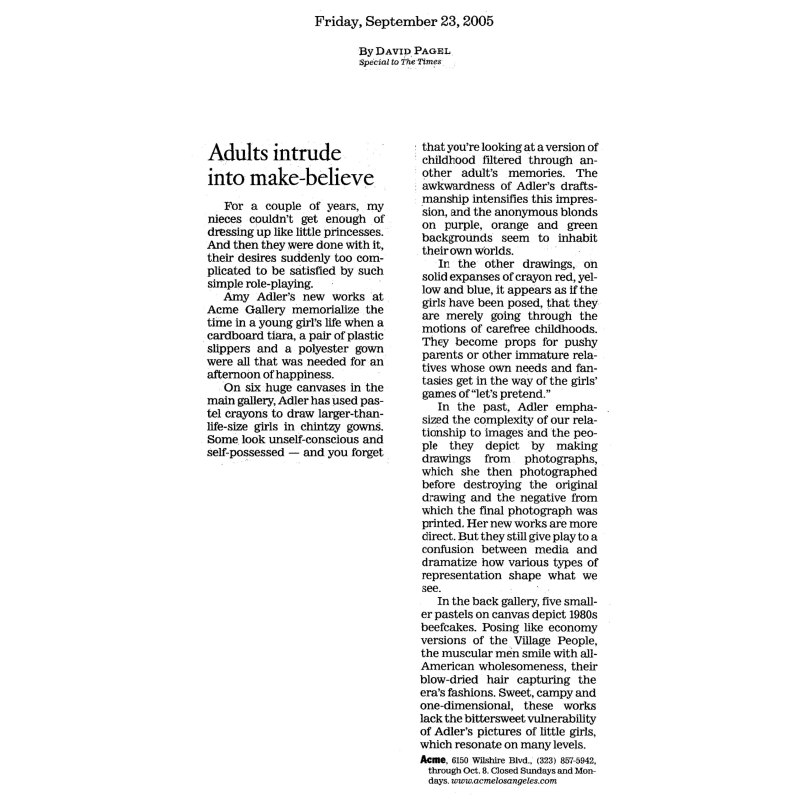 ADULTS INTRUDE INTO MAKE-BELIEVE (THE LOS ANGELES TIMES, DAVID PAGEL, SEPTEMBER 2005) ADULTS INTRUDE INTO MAKE-BELIEVE (THE LOS ANGELES TIMES, DAVID PAGEL, SEPTEMBER 2005)