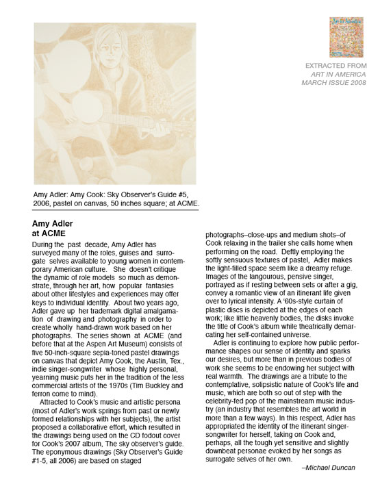 • “AMY ADLER: AT ACME” (ART IN AMERICA, MICHAEL DUNCAN, MARCH 2008)