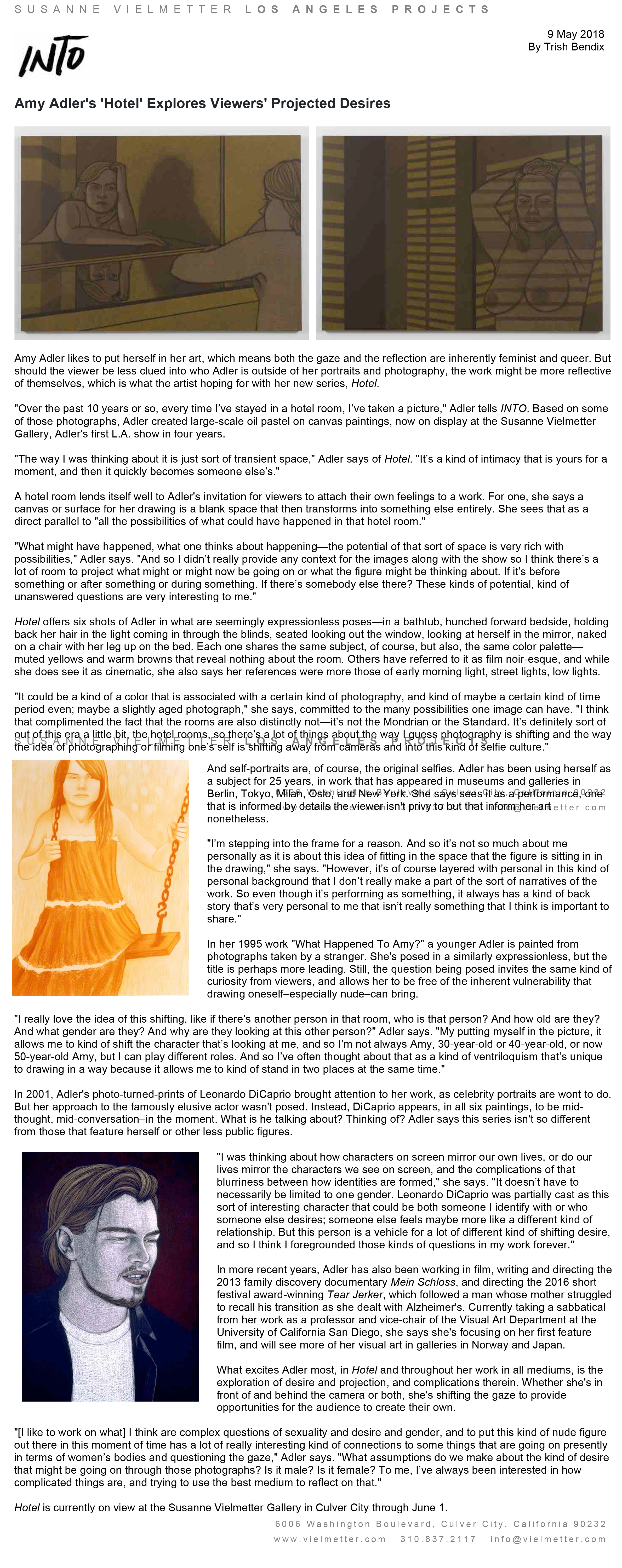Selected Text Mirror, Mirror: Amy Adler’s Portraits and the Selfie’s Seductive Gaze, (OC ART BLOG, Tyler Stallings, June 16, 2025) Speaking to the Fragile Specimens of Hollywood, (ARTNOW LA, Zara Kand, Dec 19, 2023) Still: Amy Adler (East of Borneo, Jordan Karney Chaim, July, 2022) Amy Adler (HereIn Journal, March, 2022) Amy Adler’s ‘Hotel’ Explores Viewers’ Projected Desires, (INTO, Trish Bendix, May 9, 2018) Paper Movies (Art Journal, Liz Kotz, Winter 2015) Amy Adler: at Acme (Art In America, Michael Duncan, March 2015) Amy Adler at Acme (Art In America, Michael Duncan, March 2008) Aspen Art Museum (Amy Adler: Make Believe, Heidi Zuckerman Jacobsen, 2007) Museum of Contemporary Art San Diego (Rachel Teagle. “Cerca Series: Amy Adler”, 2006) Adults Intrude Into Make Believe (The Los Angeles Times, David Pagel, September 2005) Twin Palms Publishers (Cay Sophie Rabinowitz, Amy Adler Young Photographer, 2005) Photos of Drawings of Photos:DiCaprio Twice Removed (The Los Angeles Times, Christopher Knight, February 2002) UCLA Hammer Museum, Los Angeles, CA (Claudine Ise, “Amy Adler Photographs Leonardo Di Caprio”, 2002) Contemporary Arts Museum, Houston (Paola Morsiani, “Relative Positions: Amy Adler, Liza May Post, Francesca Woodman, 2001) Art in Review: Amy Adler (The New York Times, Roberta Smith, May 2000) Amy Adler curates Joni Mitchell (Artext, Malik Gaines, May 2000) A Thousand Words: Amy Adler (Artforum, M.G. Lord, April 1999) Amy Adler: Surrogates (Artext, Liz Kotz, May-July 1998) Reflecting on Life’s Darker Side: Amy Adler (The Los Angeles Times, Christopher Knight, December 1998) Museum Of Contemporary Art, Los Angeles (Connie Butler, ” Amy Adler”, 1998) Amy Adler (Time Out New York, Linda Yablonsky, September 1997) Amy Adler (Artforum, Ingrid Schaffner, November 1996) Enter Youth, With Subtlety (The New York Times, Roberta Smith, May 1996)